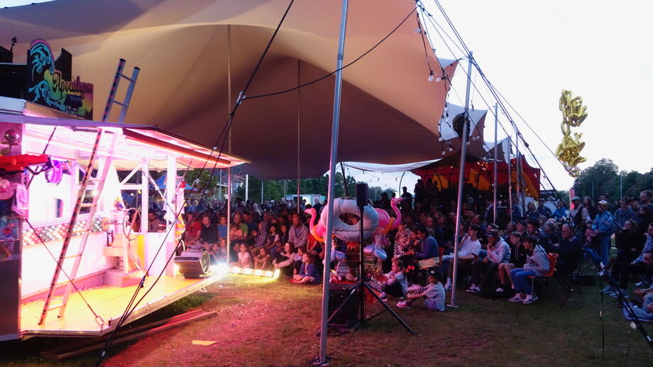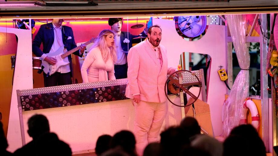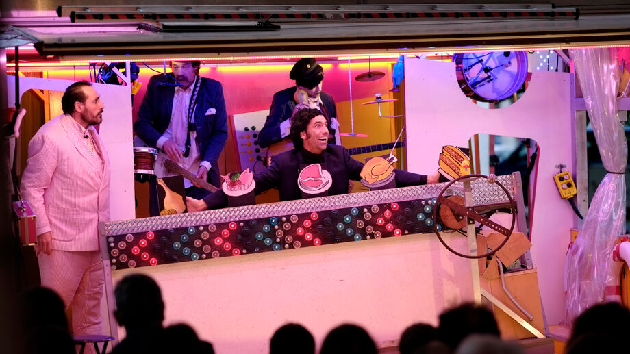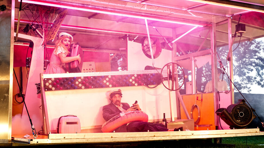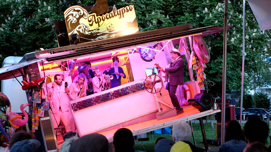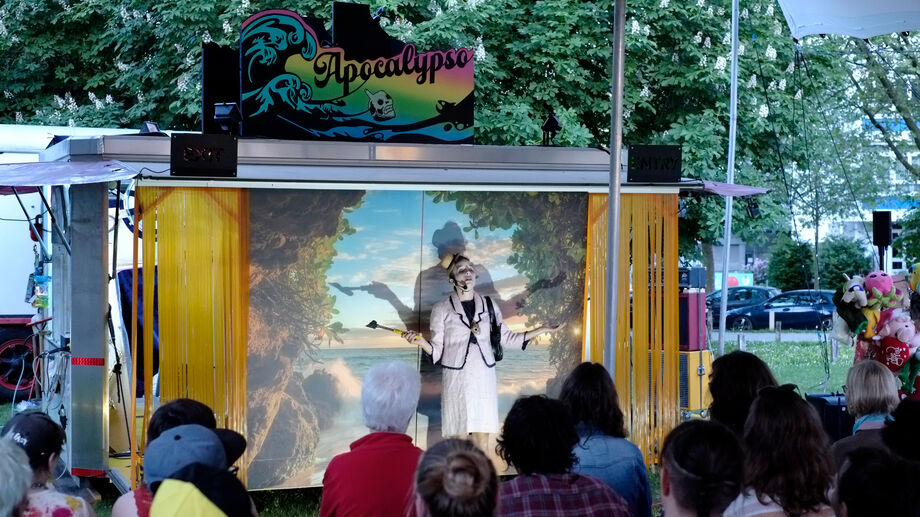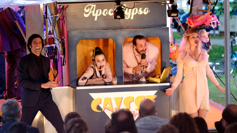 Eine kuriose Schicksalsgemeinschaft steht am Rande des Abgrunds! Ihre schrille Jahrmarktsmaschine gibt nach einer überraschenden Sabotage ihren Geist auf, und katapultiert die Crew von einer absurden Szene in die nächste. In diesen werden die sechs Protagonist:innen mit ihrer innigen Beziehung zur Apokalypse konfrontiert: Zerstörung – Hunger – Krankheit – Krieg – Tod. Klischees werden umgestossen, Plastik wird gegessen, Eingeweide sprudeln hervor, der Massenkonsum wird lauthals besungen, die Stille gelobt. Das Publikum sieht staunend zu, wie ein mögliches Ende der Welt – das «après nous le déluge» – im Rhythmus einer farbenfrohen Raw- Calypso-Musik gespielt wird.